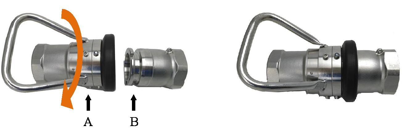 将母头端(图示A)对准公头端(图示B)顺时针旋转15°连接在一起,此时,阀门还是关闭的。继续顺时针